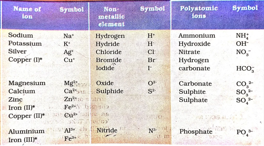 बहुपरमाणुक आयन (Polyatomic Ions): परमाणुओं का वह समूह जो एक इकाई की तरह कार्य करता है और उस पर निश्चित आवेश होता है (जैसे: OH−, NO3−)।